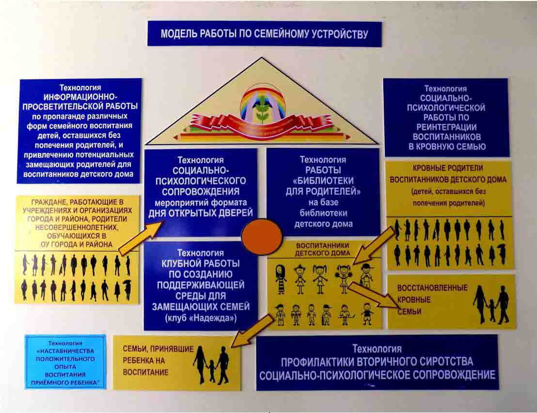 Работа по семи направлениям ведется по особой технологии, имя которой: «Модель работы по семейному устройству детей, оставшихся без попечения родителей». Реализация разработанной технологии начинается с адаптации и социализации воспитанников нашего учреждения. Модель работы службы Службой содействия семейному устройству детей-сирот и детей, оставшихся без попечения родителей, и сопровождения замещающих семей реализуются следующие программы: Адаптация и социализация детей-сирот и детей, Программа «Адаптация и социализация детей-сирот и детей, оставшихся без попечения родителей 3-7 лет в обществе» направлена на подготовку воспитанников к изменяющимся условиям окружающей среды и самостоятельной жизни в современном обществе. Программа рассчитана на 6 месяцев, от 16 до 24 занятий по 15-30 минут, 1 раз в неделю. Состоит из 9 блоков, которые формируют у детей практические навыки, умения и знания о семье, о семейных правилах и традициях. Подготовка лиц, желающих принять на воспитание в свою семью ребёнка, С 2011 года в ГКСУ СО "Камышинский центр помощи детям, оставшимся без попечения родителей", ведется подготовка лиц, желающих принять на воспитание в свою семью ребенка, оставшегося без попечения родителей по программе «Подготовка лиц, желающих принять на воспитание в свою семью ребёнка, оставшегося без попечения родителей». Задачами подготовки кандидатов являются: выявление и формирование у граждан воспитательных компетенций, родительских навыков для содержания и воспитания ребенка; помощь в определении своей готовности к приему ребенка в свою семью и осознании реальных проблем и трудностей, с которыми им предстоит встретиться в процессе воспитания приемного ребенка; ознакомление с основами законодательства в сфере защиты прав детей, правами и обязанностями принимающих родителей, существующими формами профессиональной помощи, поддержки и сопровождения замещающих семей. Главной особенностью Подготовки граждан к устройству детей в семью Камышинского центра помощи детям является то, что сотрудничество по подготовке кандидатов проводится со всей семьей, а именно отцы вовлекаются в курс подготовки, а затем и воспитание приемного ребенка. За предыдущие года с помощью программы "Подготовка лиц, желающих принять на воспитание в свою семью ребёнка" подготовили более 300 человек, желающих взять на воспитание в свою семью ребенка, оставшегося без попечения родителей. В дополнение к утвержденному плану подготовка кандидатов осуществляется по направлению «Активная поддержка родителей» с использованием в учебном процессе модели «Родительская пирамида», которая способствует более позитивной и полноценной социально-психологической реабилитации ребенка в приемной семье, помогает провести анализ и найти выход из самой сложной ситуации в вопросах воспитания ребенка через их проигрывание в группе.